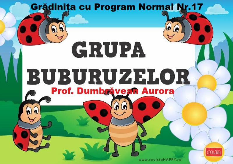 Ne propunem pentru copiii dumneavoastră, dezvoltarea unor abilități precum a avea inițiativă, asumarea responsabilității, luarea deciziilor pentru ei înșiși, comunicarea eficientă. De asemenea urmărim dezvoltarea unor calități cum ar fi: onestitatea, cooperarea, responsabilitatea, curajul, respectul, încrederea în sine, stima de sine și autodisciplina. Noi, grupa „Buburuzele”, poposim zi de zi, clipă de clipă în lumea minunată a cunoașterii. Mămăruțele prietenoase, vesele și jucăușe sunt mereu curioase și pline de entuziasm.